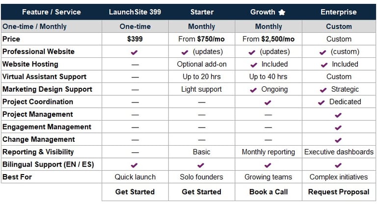 Bilingual (English/Spanish) professional services designed for founders, startups, and organizations that need reliable execution, structure, and delivery—without hiring full-time teams.